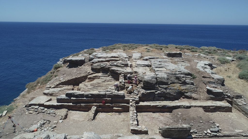 Σημαντικά ήταν τα αποτελέσματα της συνεργατικής ανασκαφικής έρευνας του Τομέα Αρχαιολογίας του Τμήματος Ιστορίας, Αρχαιολογίας και Κοινωνικής Ανθρωπολογίας του Πανεπιστημίου Θεσσαλίας και της Εφορείας Αρχαιοτήτων Κυκλάδων του Υπουργείου Πολιτισμού και Αθλητισμού πραγματοποιήθηκε και φέτος στη βραχονησίδα «Βρυοκαστράκι», απέναντι από το «Βρυόκαστρο», δηλ. την αρχαία πόλη της Κύθνου, από 29 Ιουνίου έως 31 Ιουλίου. Η θέση κατοικήθηκε αδιάκοπα από τον 12ο αιώνα π.Χ. έως τον 7ο αιώνα μ.Χ., ενώ υπάρχουν πλέον σαφείς ενδείξεις και για την παρουσία Κυκλαδικής εγκατάστασης της 3ης χιλιετίας π.Χ. (εικ. 1-2). Οι εργασίες επικεντρώθηκαν στους τρεις τομείς που ερευνούνται από το 2018: το μνημειώδες ιερό των Γεωμετρικών-κλασικών χρόνων, το επίμηκες Κτήριο 2 της ύστερης αρχαιότητας και την τρίκλιτη πρωτοβυζαντινή βασιλική.